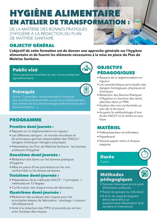 - L’objectif de cette formation est de donner une approche générale sur l'hygiène alimentaire et de fournir les éléments nécessaires à la ise en place du plan de Maitrise Sanitaire.
